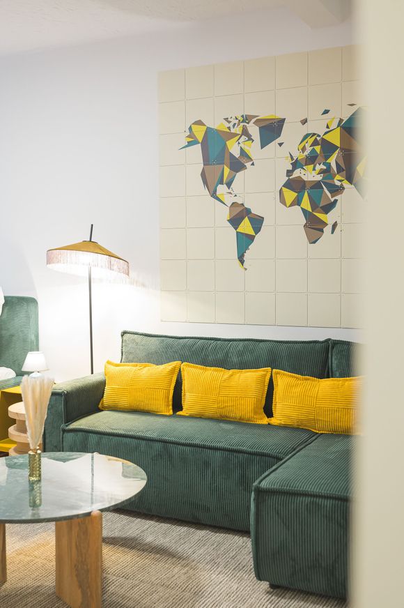 Light wood, soft textures, and gentle green and yellow tones create apartments that are modern, inviting, and full of personality.